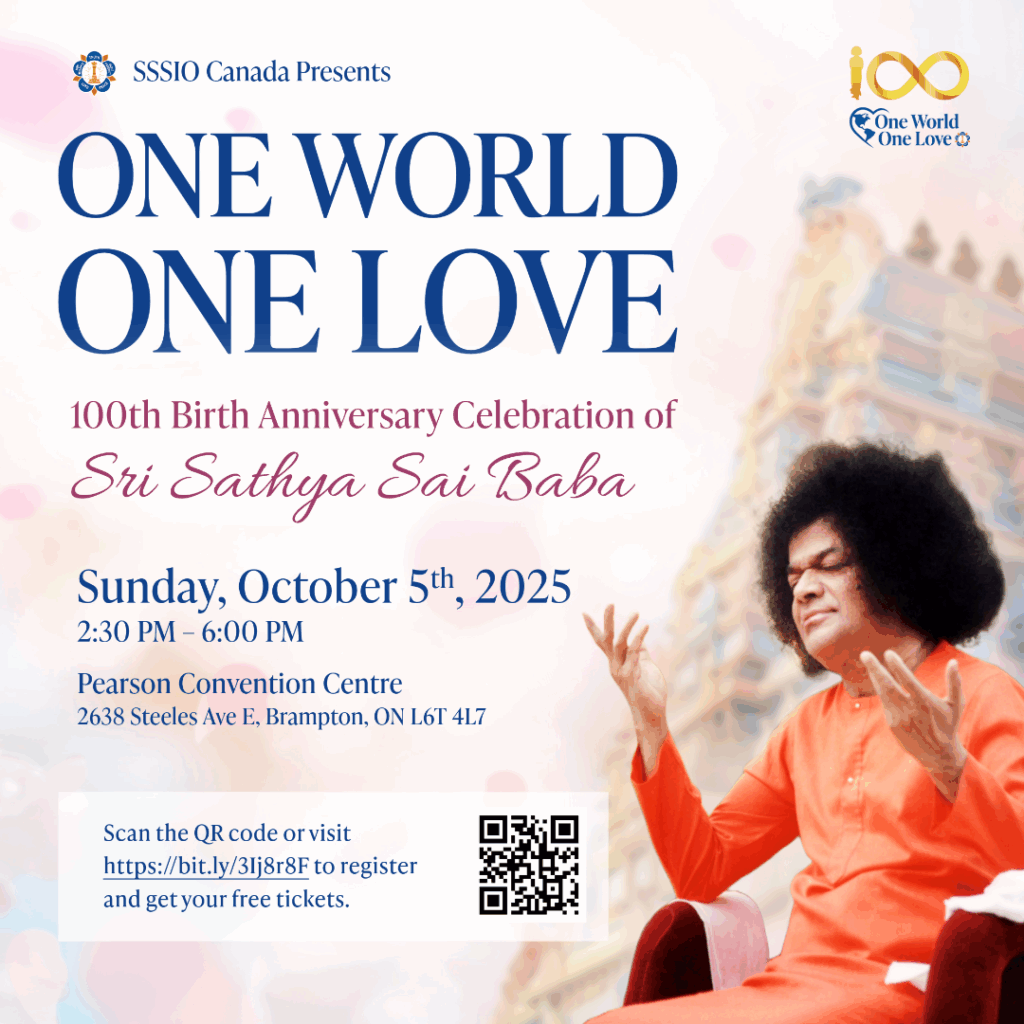 Join us for a memorable afternoon of spiritual reflection, soulful music, and meaningful community connection. This special multi-faith event honours the enduring legacy of Sri Sathya Sai Baba and celebrates His profound impact across the world. Please register at https://bit.ly/3Ij8r8F